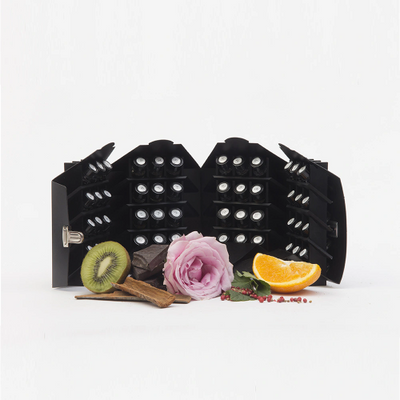 Designed and developed as a mini perfumer’s organ, this olfactorium® holds 48 vials of 2.5ml, each containing a different fragrance raw material in an alcohol solution. This essential tool will guide you through the perfumer’s world, as you discover the key raw materials of perfumery.